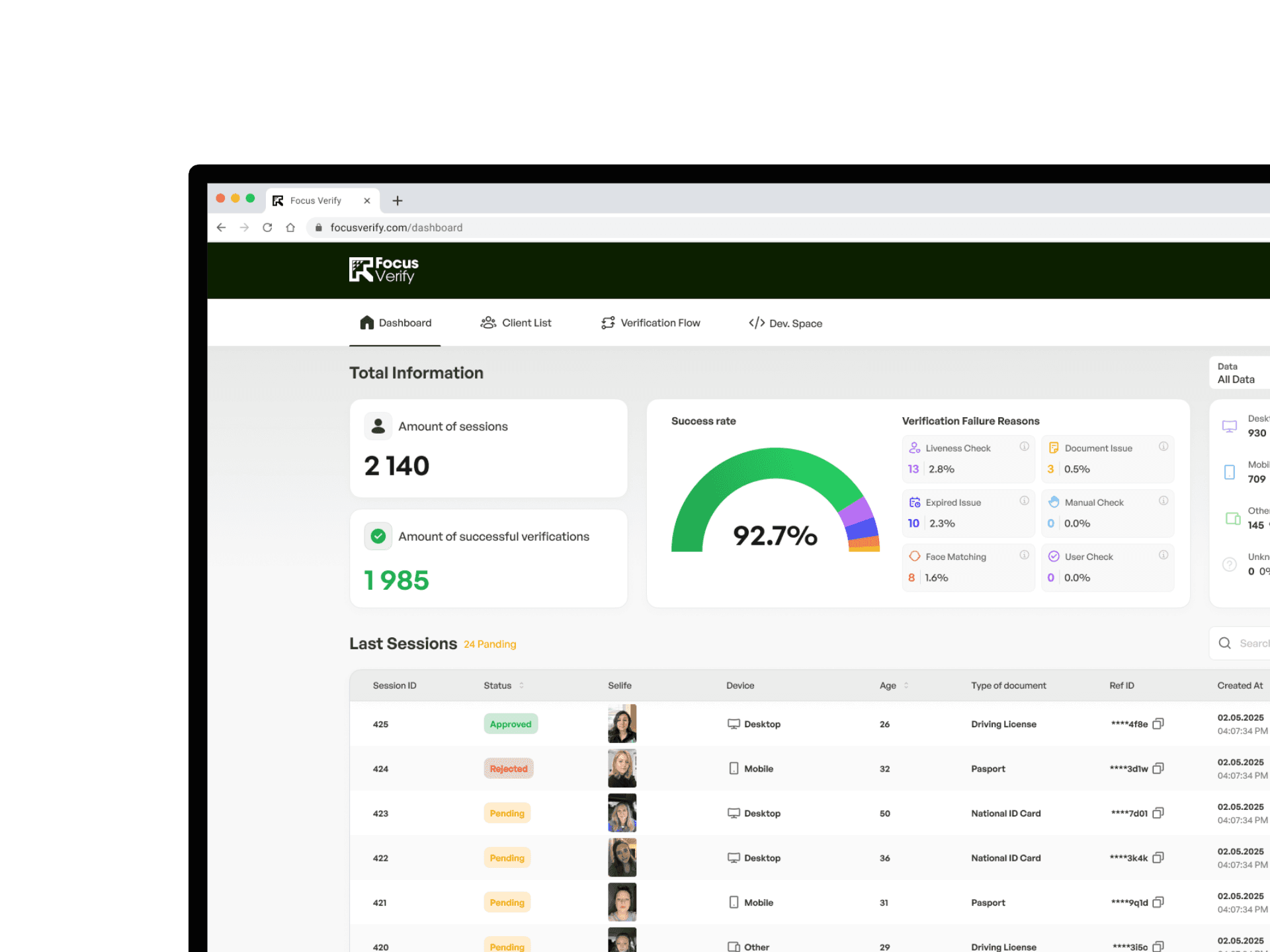 Focus Verify's dashboard offers a perfect overview with all the essential insights and reports at your fingertips. Manage users effortlessly and access detailed analytics to streamline your verification processes. It's designed to provide you and your team with the tools needed for efficient and effective identity management.